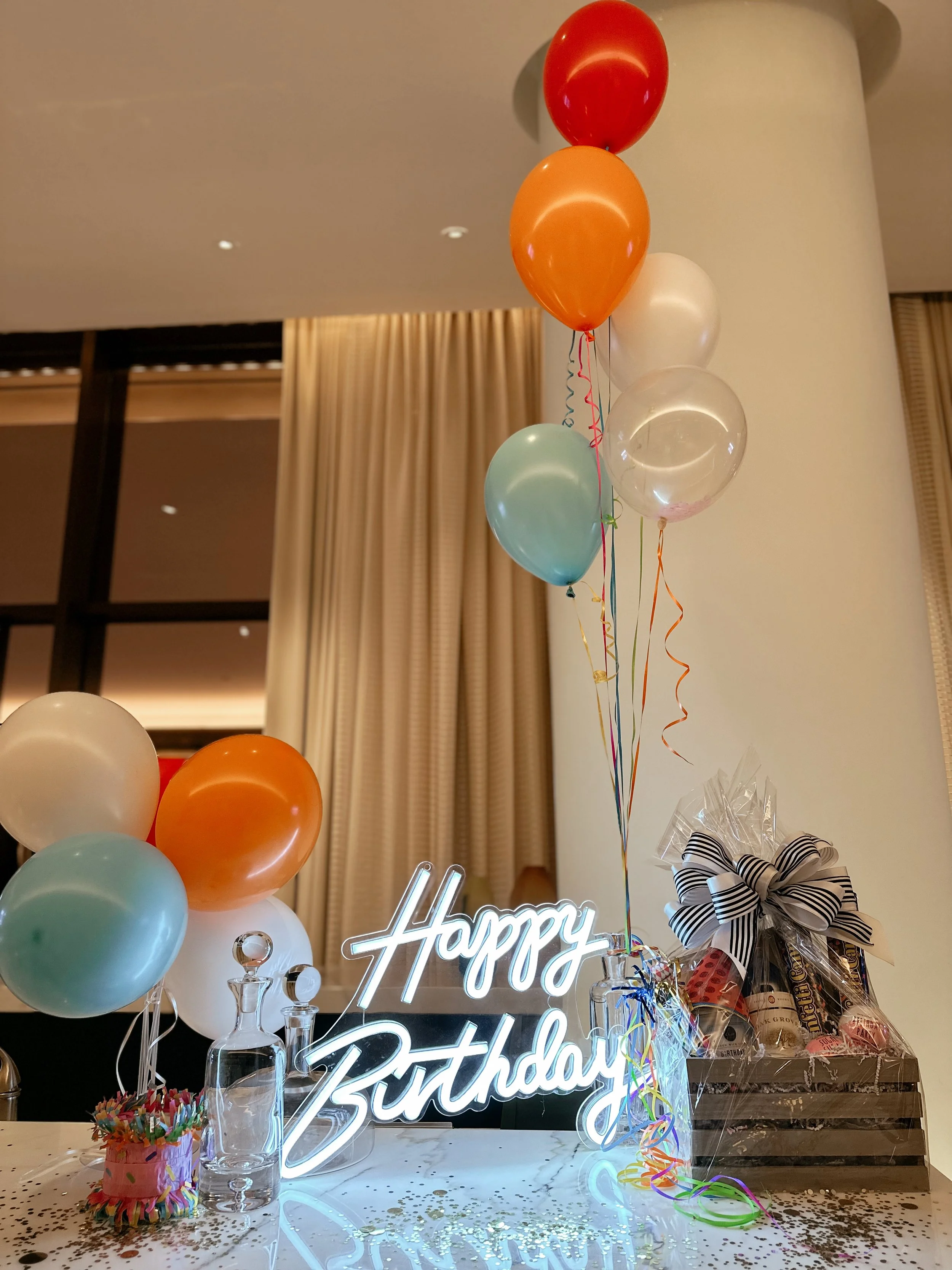 Transform your suite into a birthday paradise with lively decorations and a personalized gift box, making your special day truly unforgettable.