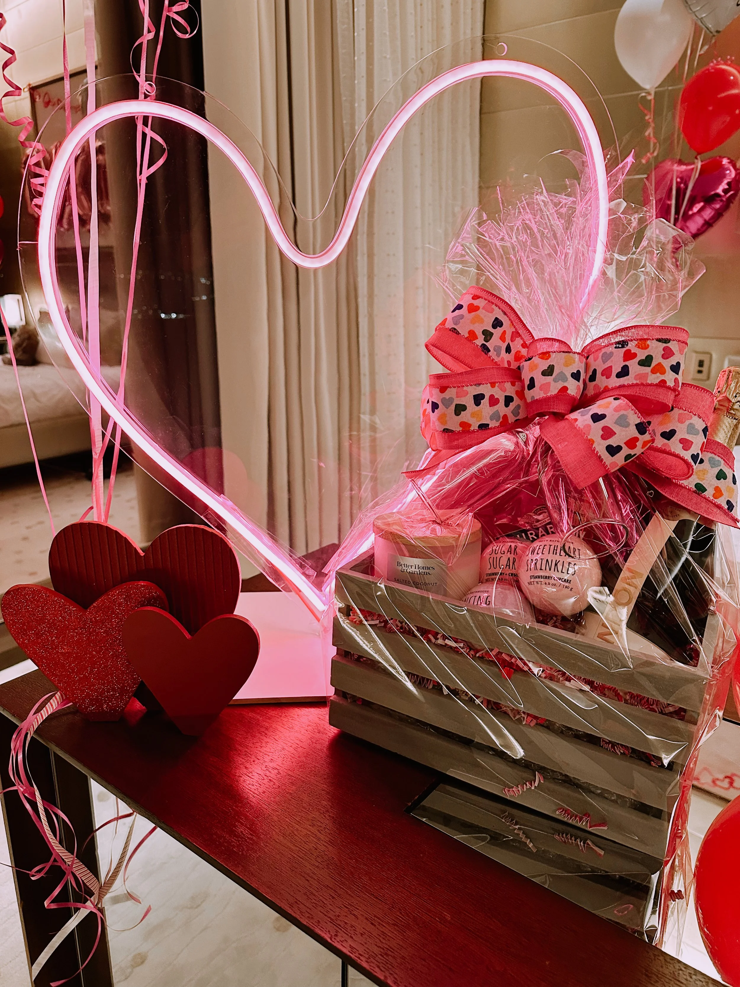 Mark your anniversary with enchanting suite decorations and a luxurious gift box, adding a layer of sophistication to your celebration of love.